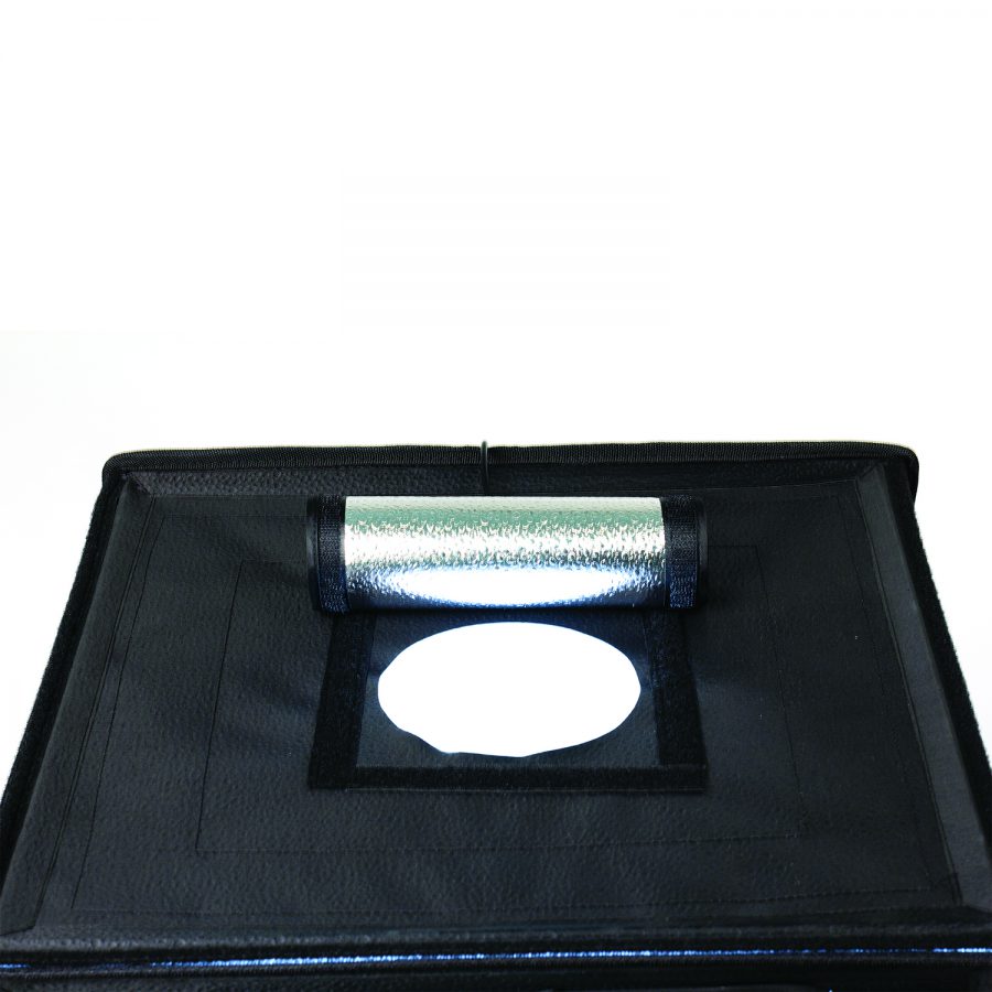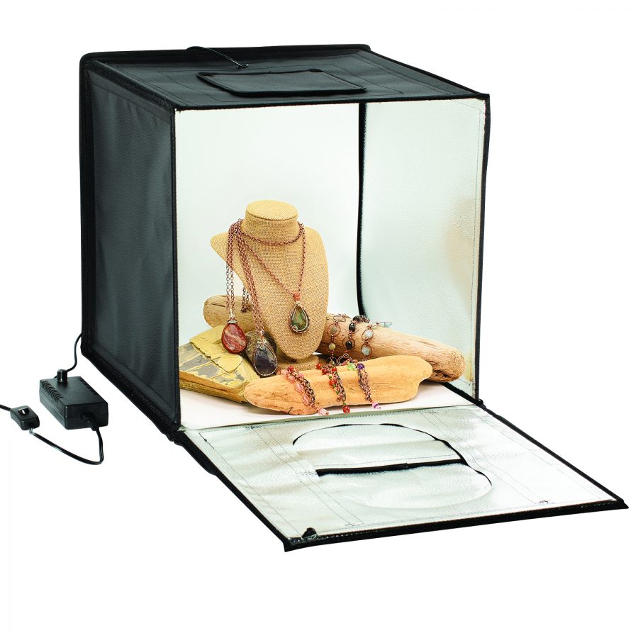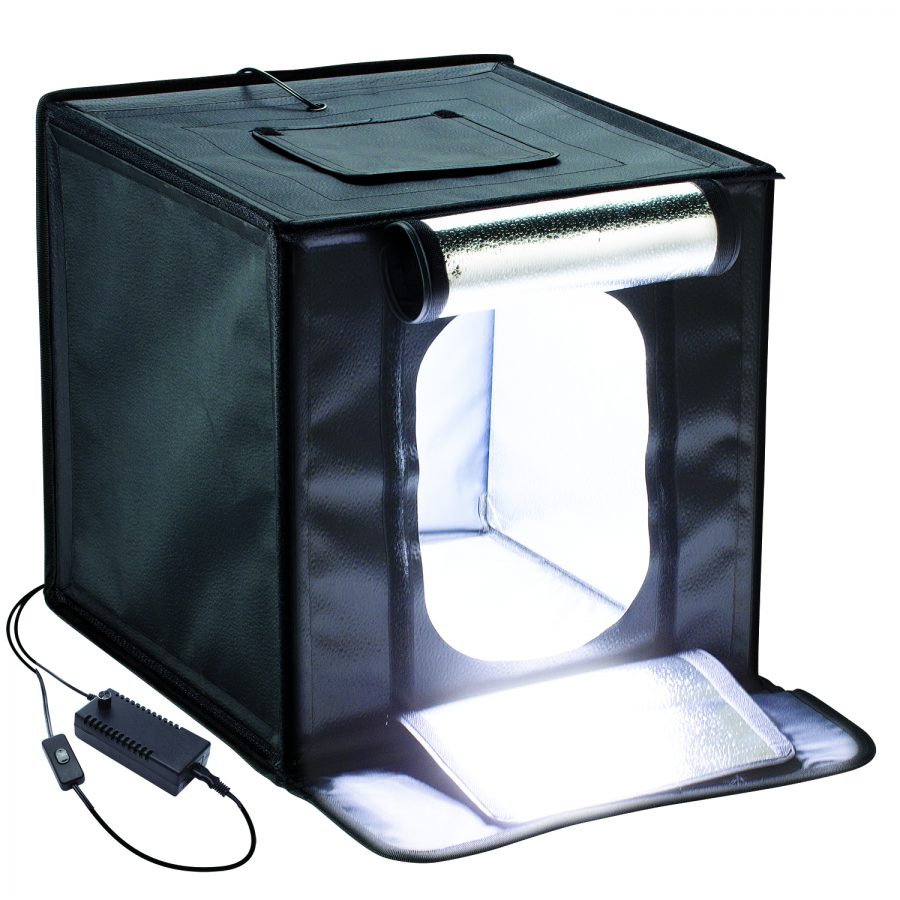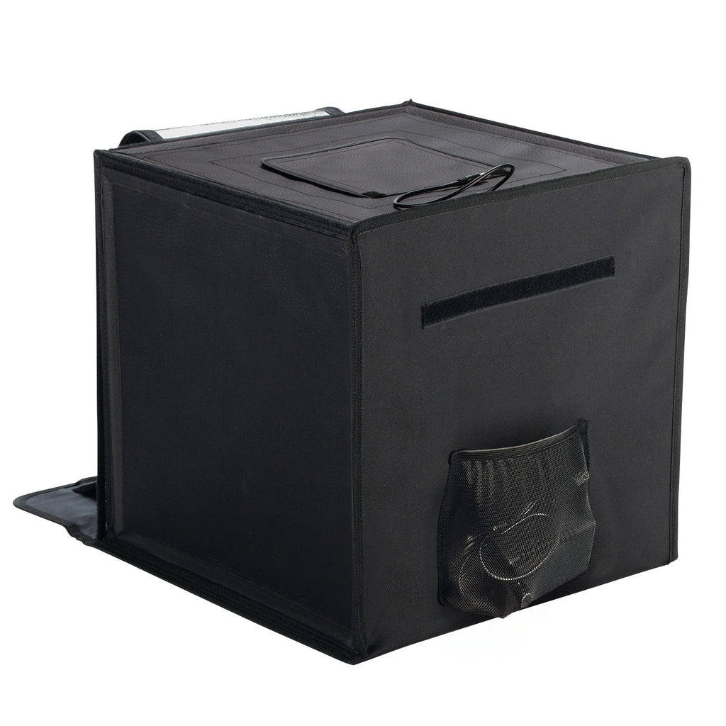 Smith-Victor LED Desktop Studio is the fastest and easiest way to get professional looking images using a phone or camera. Quick and easy to assemble even in a compact space. Allows for shots through the front opening or through the roof. When done, it folds flat for easy storage or transport. The handle and light control pouch make it easy to carry anywhere. This new and improved version is larger and has several new features.