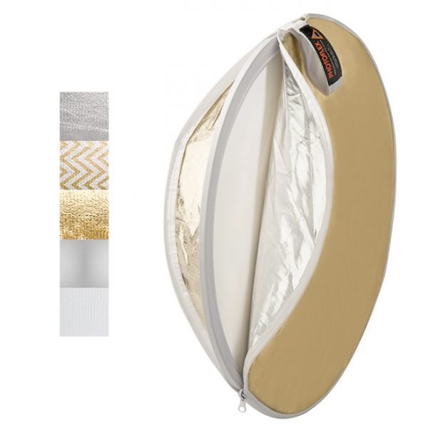 An exceptionally versatile light modifier system for controlling and directing light in a wide variety of situations. The core of the system is a circular translucent diffuser, which is used to subtly reduce contrast and subdue light intensity for a softer quality of light. A reversible zippered fabric cover is included to convert this into one of four reflector types: white, to reflect light with natural highlights; matte silver, to achieve specular highlights with a neutral color balance; gold, to produce a strong warming effect with specular highlights; and soft gold, which blends gold and silver in a zig-zag pattern to achieve a slight warming effect with bright, brilliant highlights. The surfaces are double-laminated for high reflectance and durability, and the translucent diffuser uses a double-riveted steel spring frame to ensure a consistent shape over time while maintaining a flat profile when expanded. Additionally, a dedicated carry bag is included for storage and travel of the collapsible disc and the reversible fabric cover.
