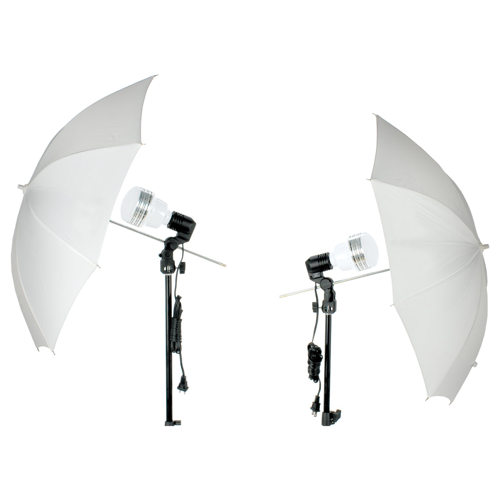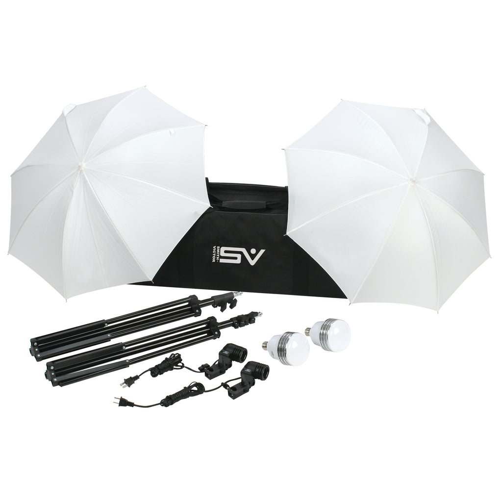 The Smith-Victor KT750LED 2 Light Umbrella Kit features two high-quality 45 watts LED fan-cooled bulbs that produce the equivalency of 375 watts of incandescent light each with very little heat. These low energy bulbs have a very high CRI of 95 which produces even, soft light, perfect for portrait or product photography.
