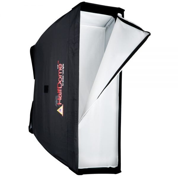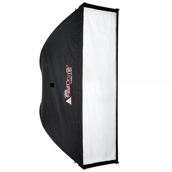 The narrow profile of the HalfDome with White Interior for strobe lights from Photoflex works well for a hair light or rim light for portraits and allows for elongated catchlights in product photography. With a white interior for soft diffusion, a removable interior baffle, and a diffusion face, it allows for high-contrast effects if desired. The recessed front face permits optional grids that narrow and direct the output and control spill light. A removable strip mask is included with each HalfDome to narrow it further. It's also a space saver when shooting in tight spaces and easy to shoot over when used as a foreground light.