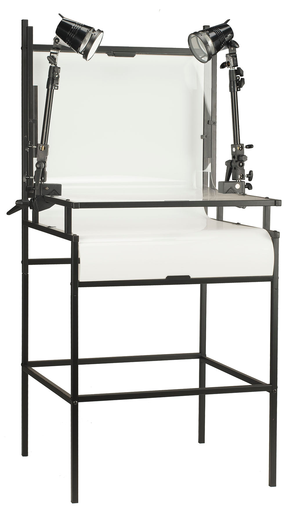 The Smith-Victor Digital Desktop Studio Kit is a complete imaging solution complete with a shooting table, lights with dimmers, and mounting arms. Use it to create shadowless, high-key lighting, or dramatic lighting effects on small tabletop setups. Each included Q250 light head provides ample illumination. Add your own diffusion sheets and gels for softer lighting effects.